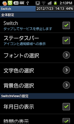 Switchをインストールしたら、まず通常のアプリとして起動します。メニューキーを押して「設定」をタップし、「Switch」にチェックを入れます。
